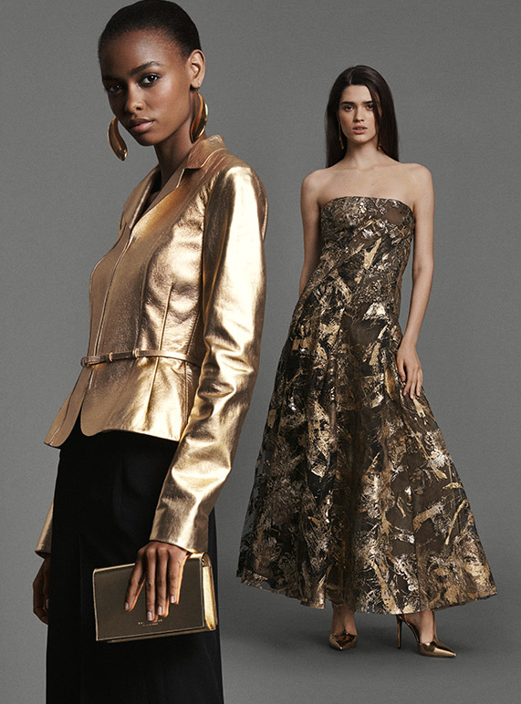 Foil-printed fabrics, metallic knits, and shimmering sequins add modern glamour